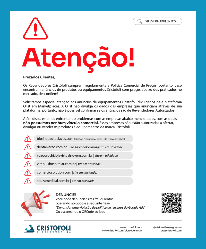 As autoclaves Cristófoli são as mais vendidas no mercado e por isso, tornaram-se alvo de sites mal intencionados e que tentam vender equipamentos da marca. Fique de olho!