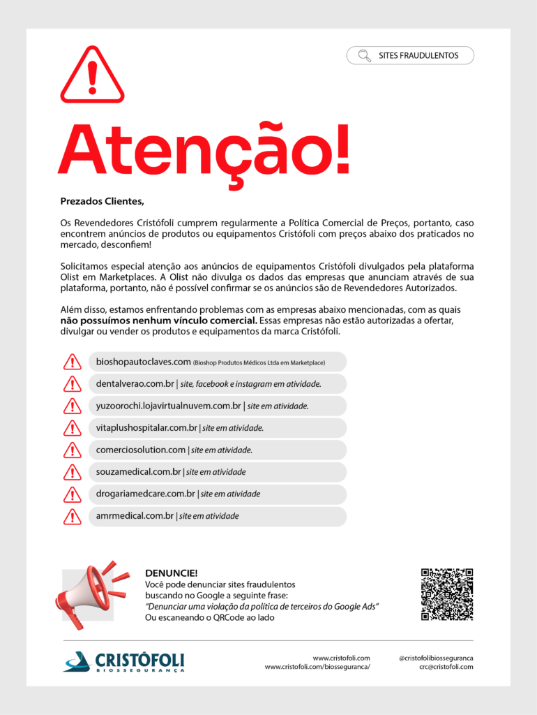 As autoclaves Cristófoli são as mais vendidas no mercado e por isso, tornaram-se alvo de sites mal intencionados e que tentam vender equipamentos da marca. Fique de olho!