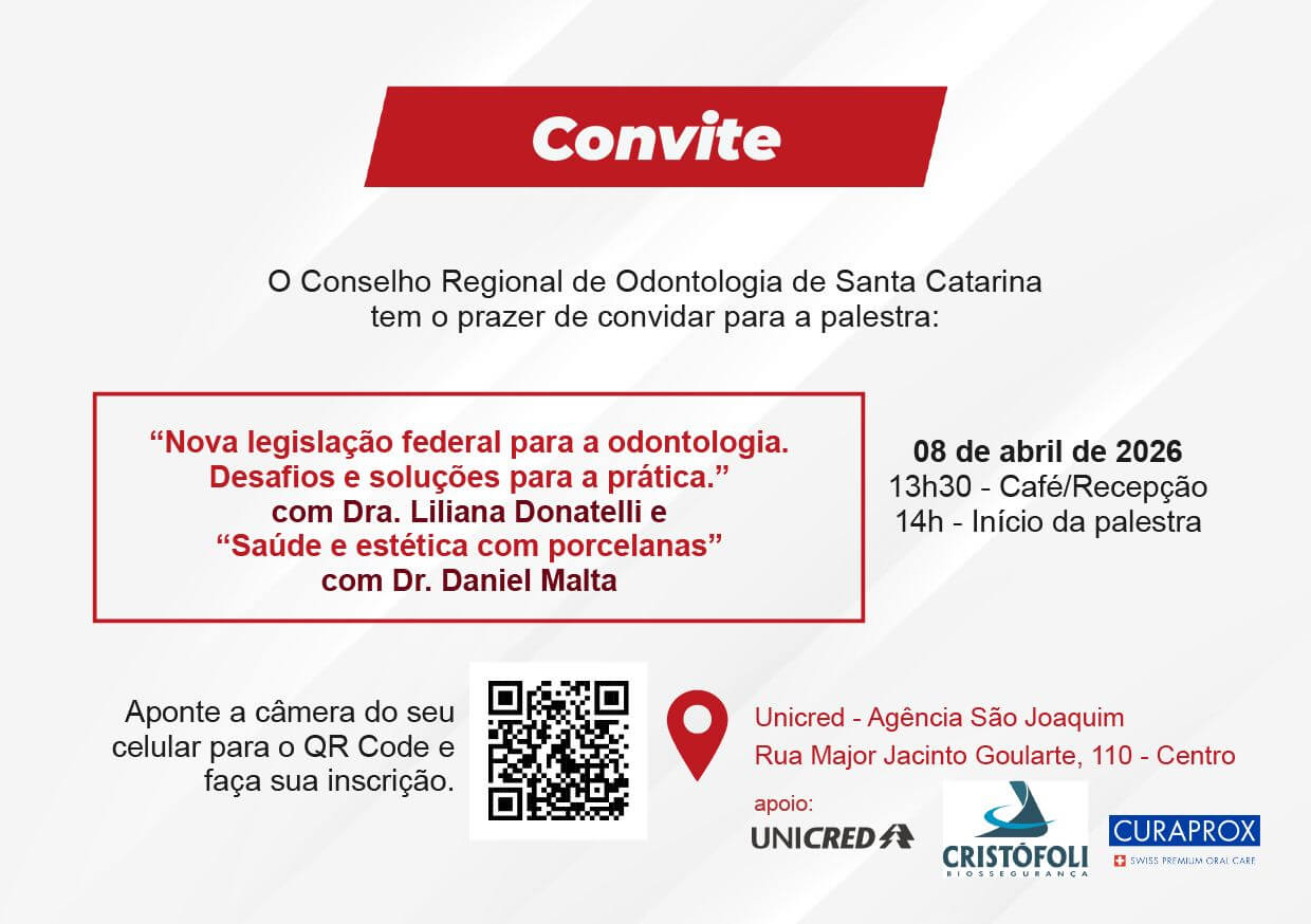 No dia 8 de abril, será a vez da cidade de São Joaquim na serra catarinense. Mais uma oportunidade para atualização profissional na área da odontologia, com palestras gratuitas e presenciais. O evento Organizado pelo Conselho Regional de Odontologia de Santa Catarina (CRO-SC), tem o apoio das marcas Cristófoli, Unicred e Curaprox, o evento é uma oportunidade imperdível e exclusiva para para cirurgiões-dentistas da área. As vagas são limitadas.