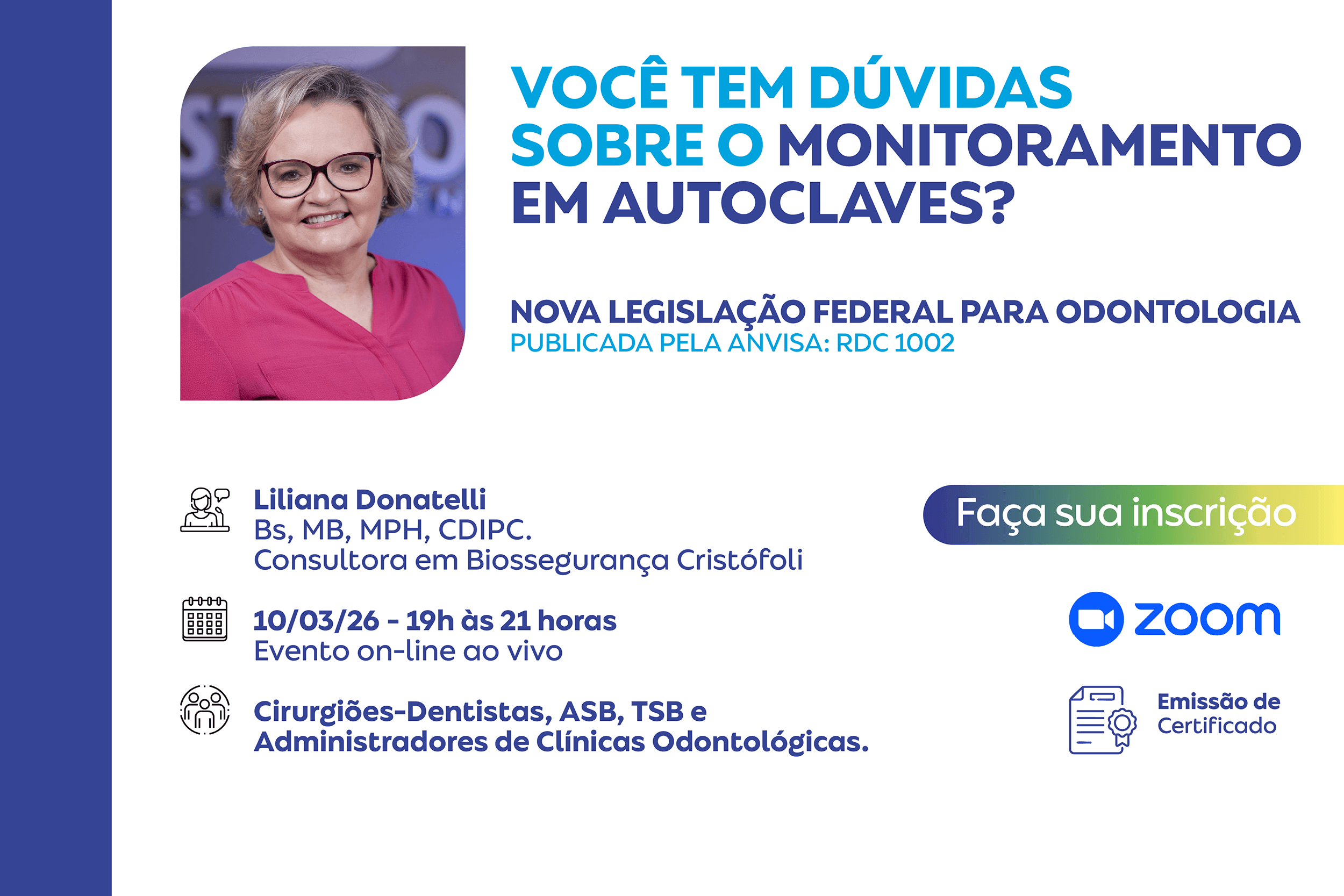 Liliana Donatelli, BS, MBA, MPH, CDIPC, irá ministrar uma palestra on-line gratuita sobre o monitoramento da esterilização para serviços odontológicos e a nova RDC”